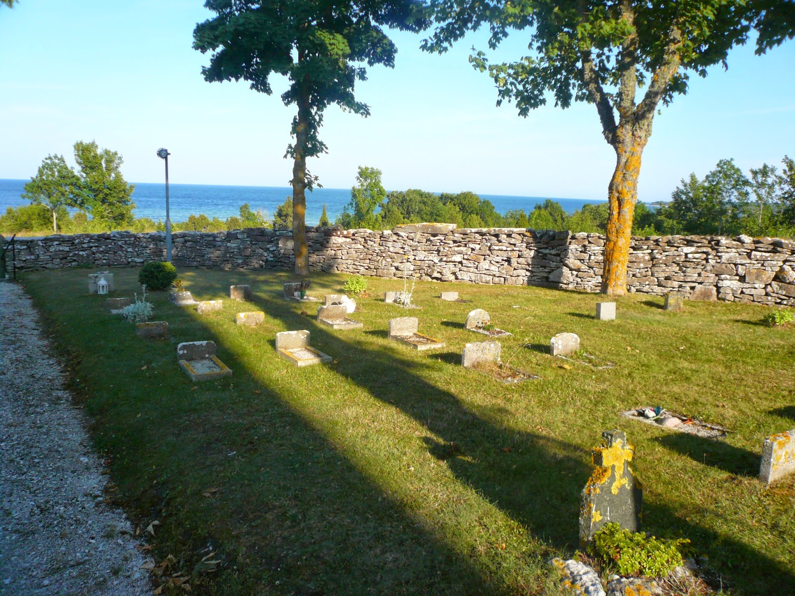 Det tar ca 8 minuter med färjan över från Fårösund till Fårö och väl på Fårö valde vi väg på måfå, utan att veta vart vägen ledde. Det visade sig att den passerade kyrkan på Fårö. Vi steg ur bilen vid kyrkans parkering och möttes av en svalka, som lyst med sin frånvaro under de heta sommardagarna. På väg in genom grindarna passerade vi en grav, som fick mig att stanna till: